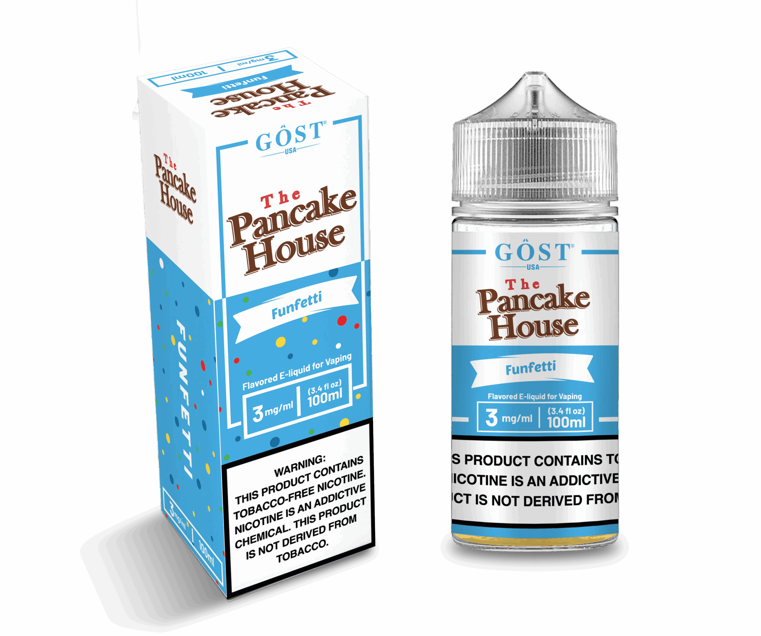 The Pancake House Funfetti e-liquid comes in a standard 100ml bottle. The bottle is made of durable plastic designed to prevent leakage. Dimensions: (Insert dimensions here)