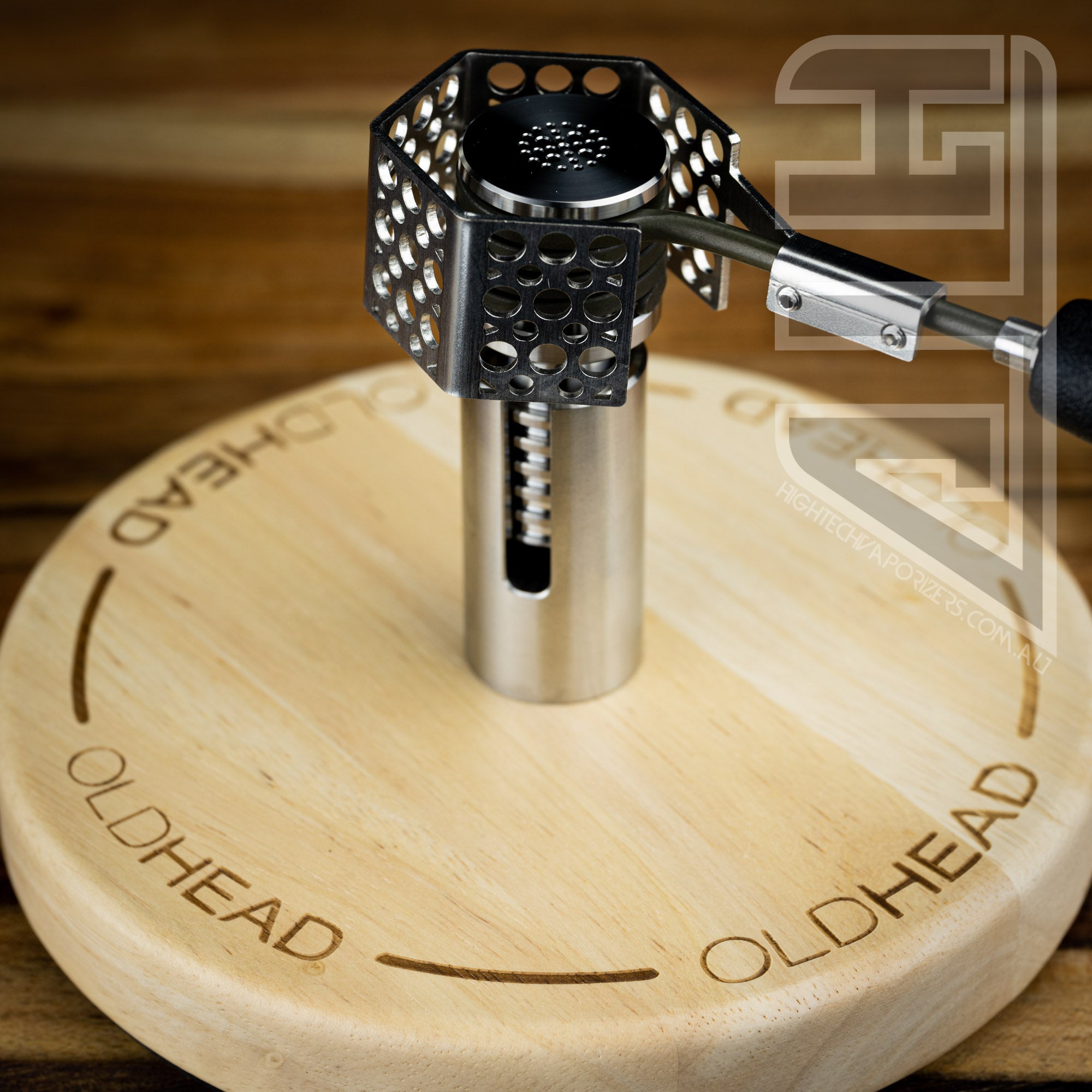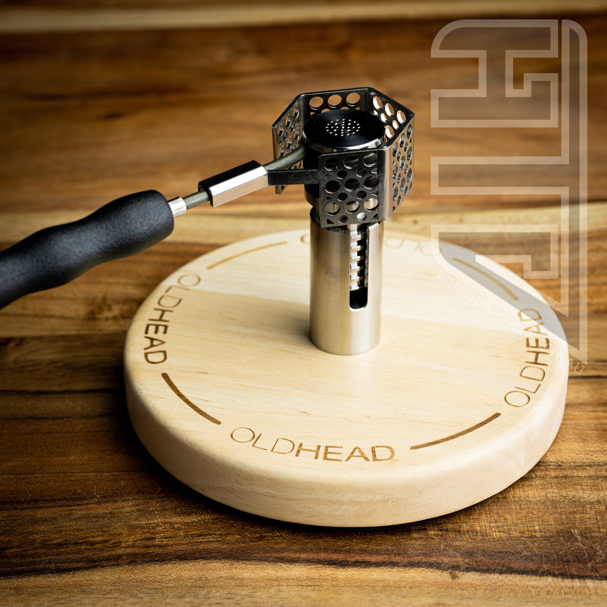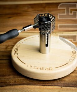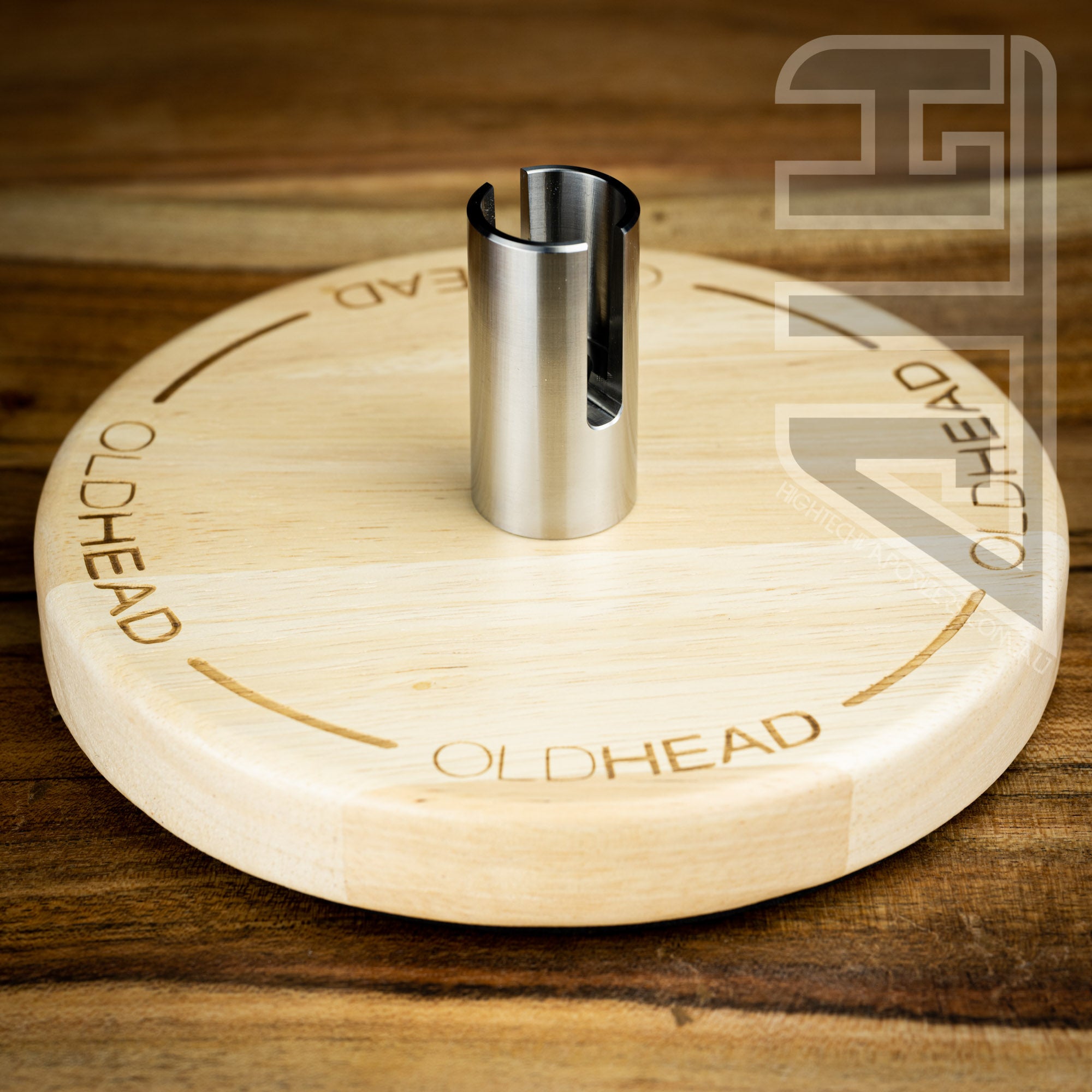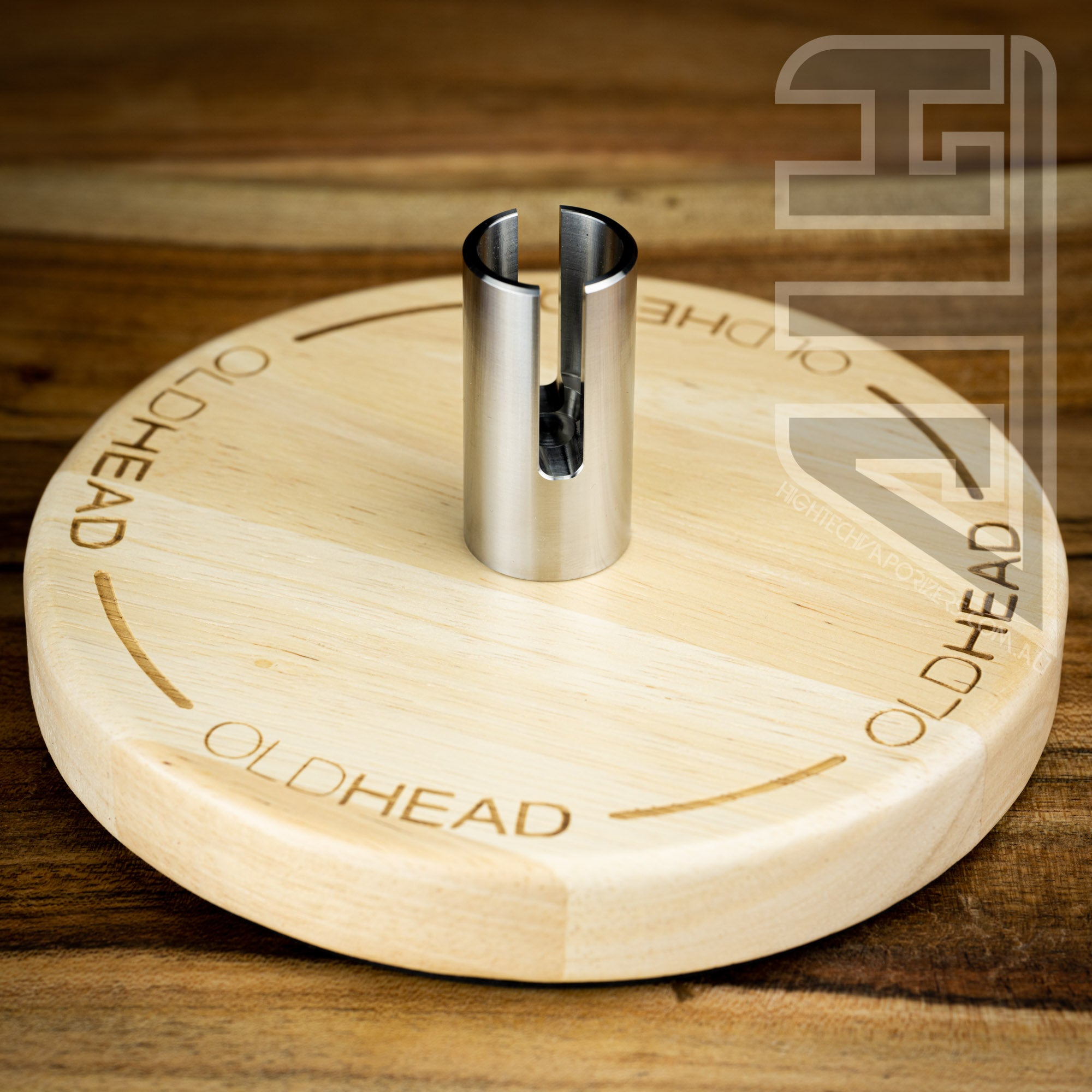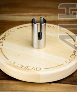 The Pro Stand is constructed out of a wood base with a solid titanium post for your engine to slide down inside of.